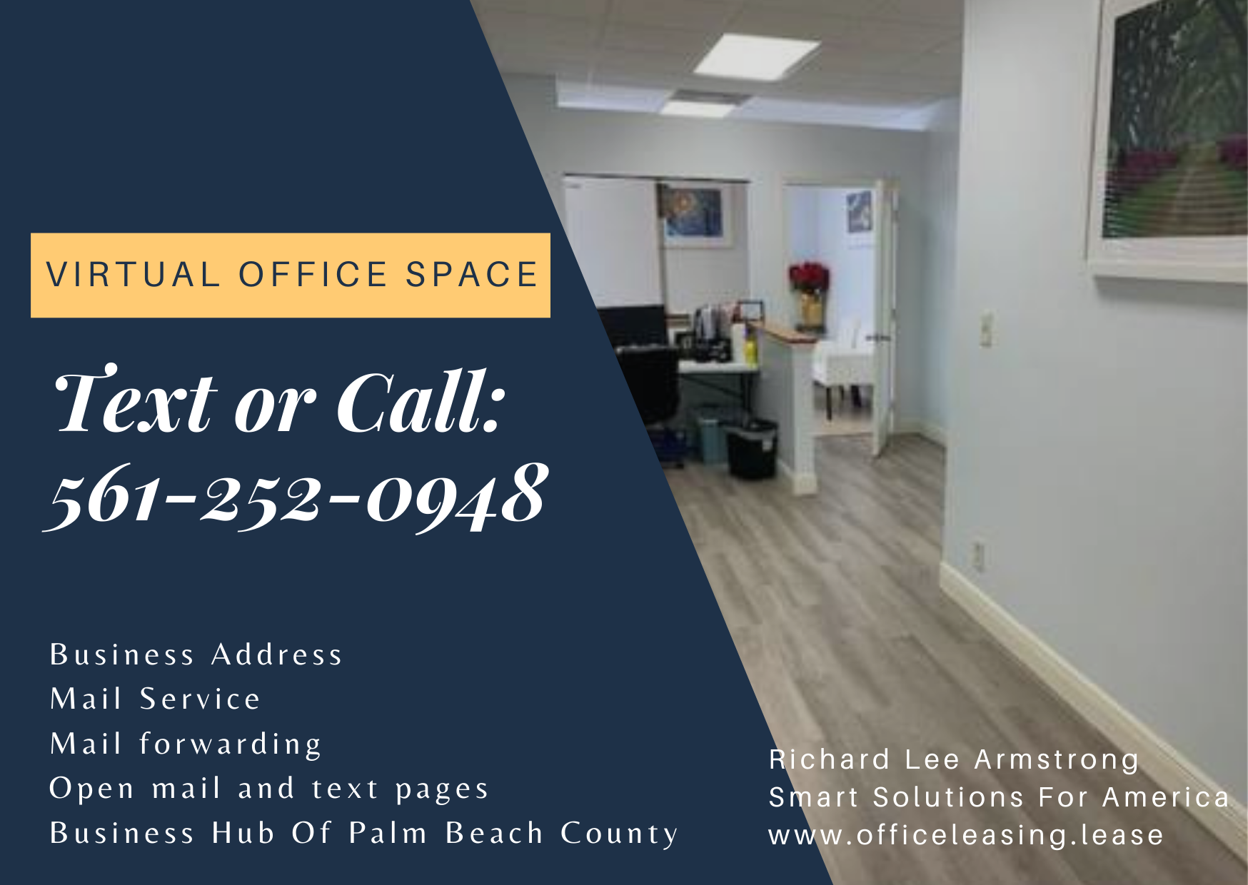 This Virtual Office for $95.00 includes sales tax, free mail service on virtual offices or Professional Office Space for $300.00 Monthly it is Month to Month no Contracts. It Includes the Internet and Electric. This is located at 2260 Palm Beach Lakes Blvd, West Palm Beach, FL 33409.